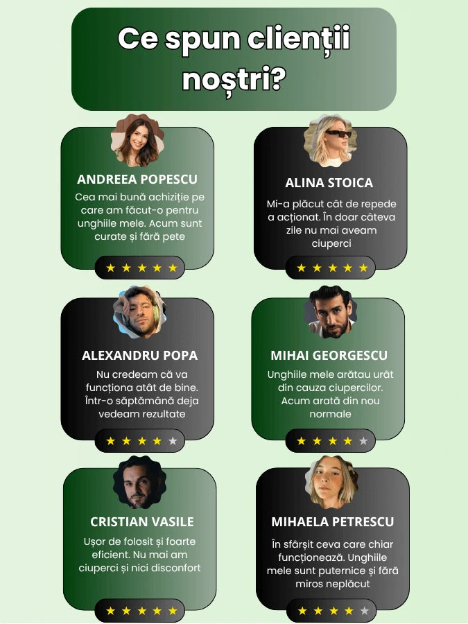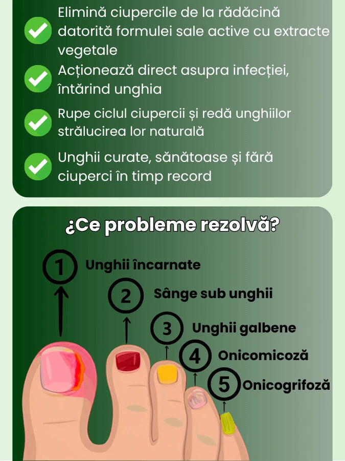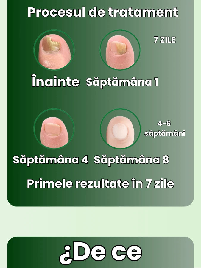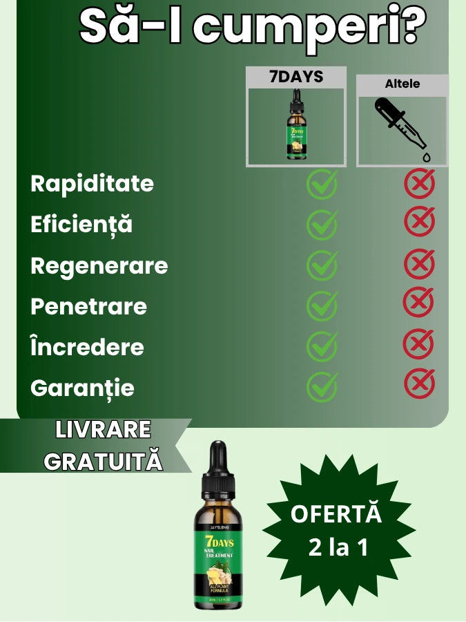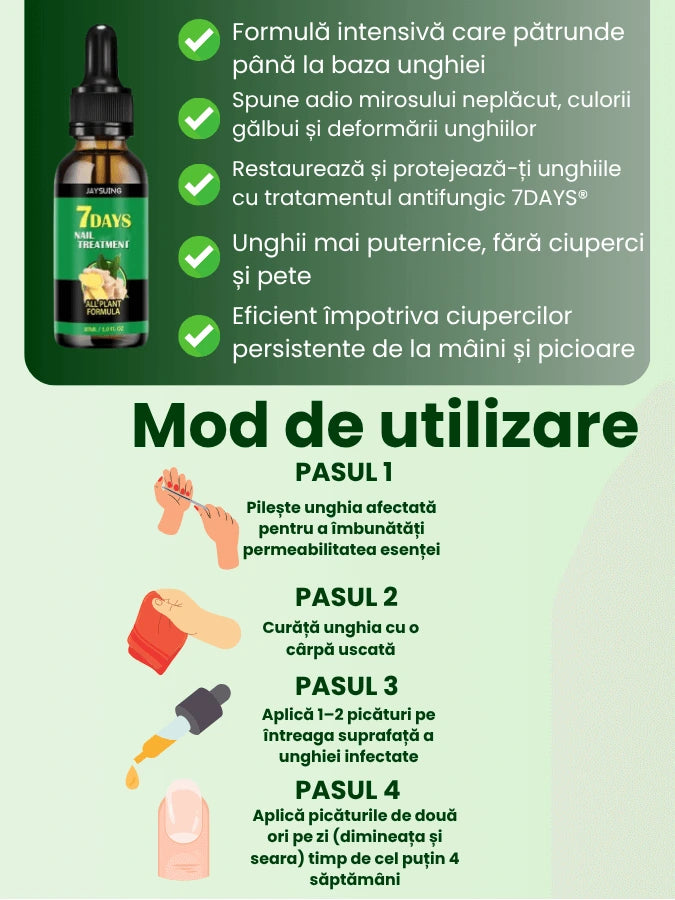✅ În doar 7 zile poți observa îmbunătățiri vizibile. Unghiile încep să se lumineze, mirosul neplăcut dispare, iar ciuperca nu mai avansează.